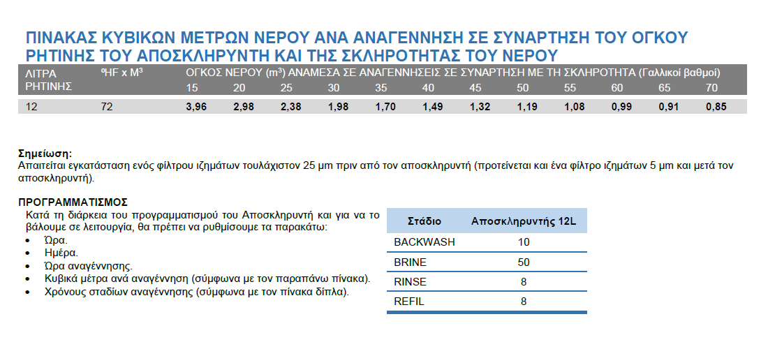 - Ρύθμιση αναγέννησης ογκομετρικά (βάση ημερήσιας κατανάλωσης) ή χρονικά (1 – 99 ημέρες)